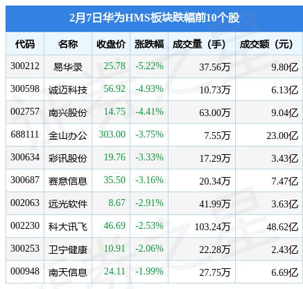 2月7日华为HMS板块较上一交易日下跌2.19%,易华录(300212)领跌。当日上证指数报收于3248.09,上涨0.29%。深证成指报收于11926.88,上涨0.12%。华为HMS板块个股涨跌见下表: