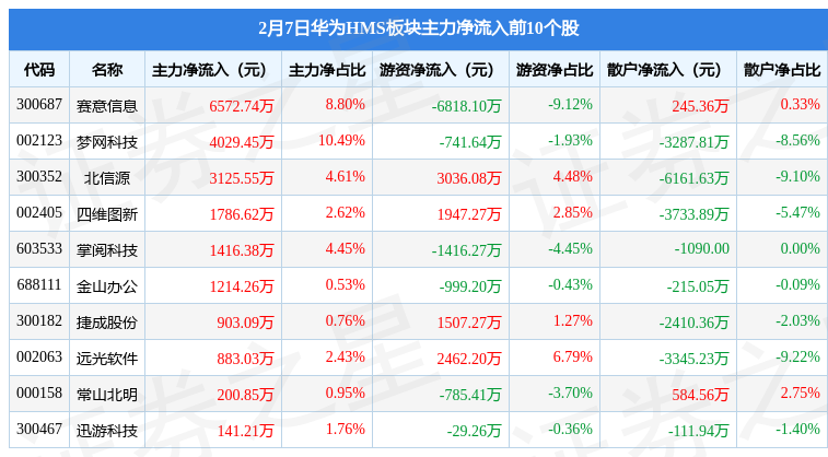 从资金流向上来看,当日华为HMS板块主力资金净流出6.47亿元,游资资金净流入2.17亿元,散户资金净流入4.3亿元。华为HMS板块个股资金流向见下表: