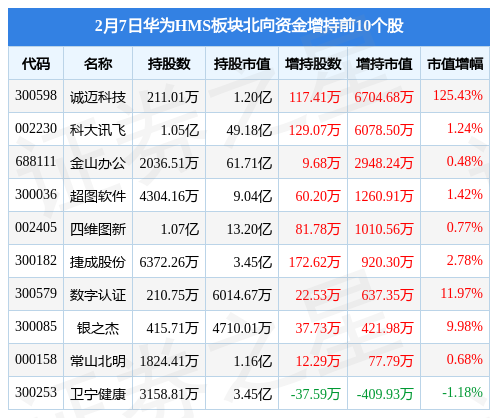 北向资金方面,当日华为HMS板块北向资金持股市值为151.1亿元,增持1.08亿元。其中增持最多的是诚迈科技(300598),增持了0.67亿元。减持持最多的是北信源(300352),减持了0.19亿元。华为HMS板块北向资金持股变动明细见下表: