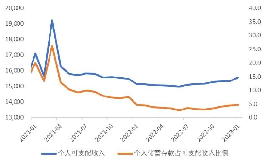 图表30:居民可支配收入和储蓄占比(十亿美元,%)